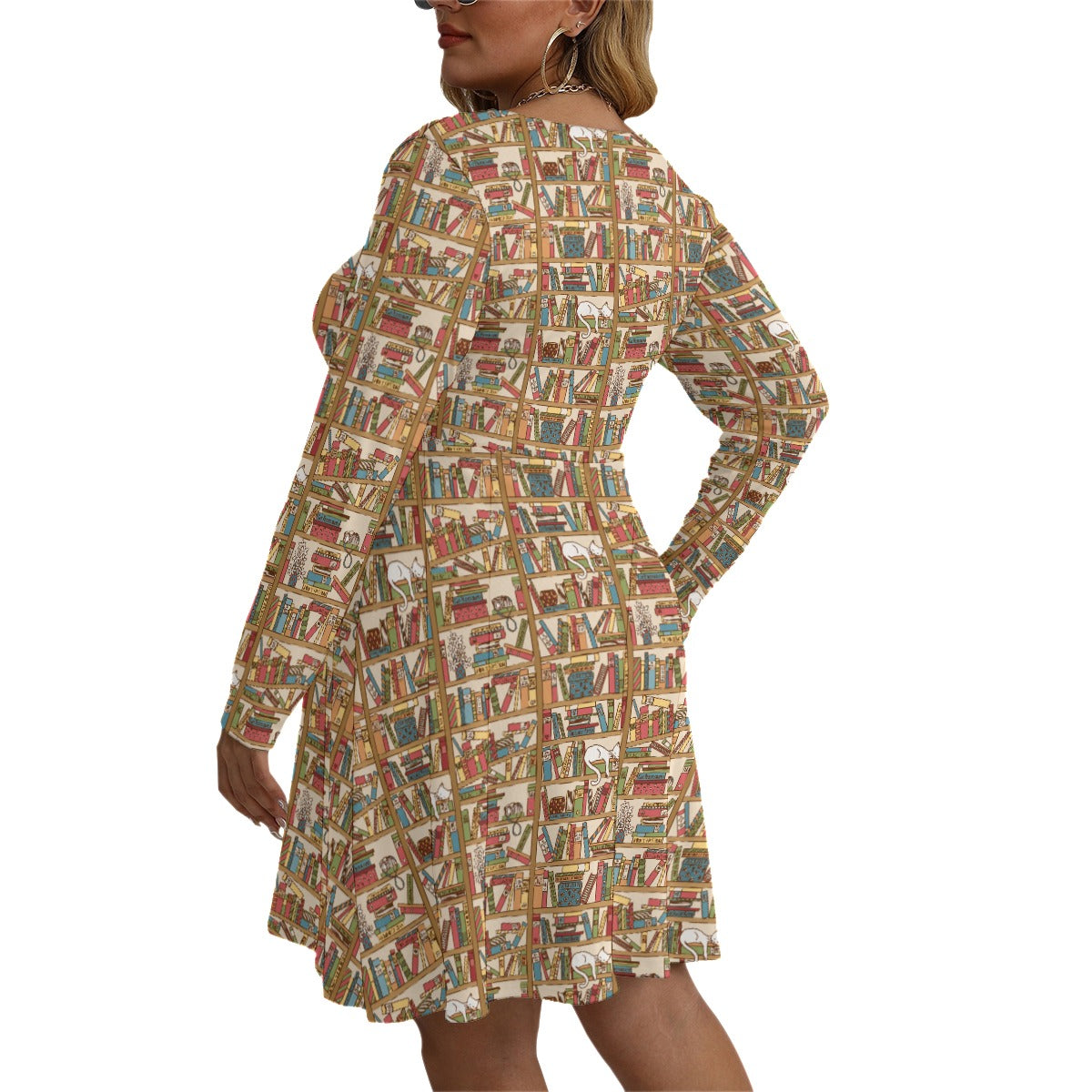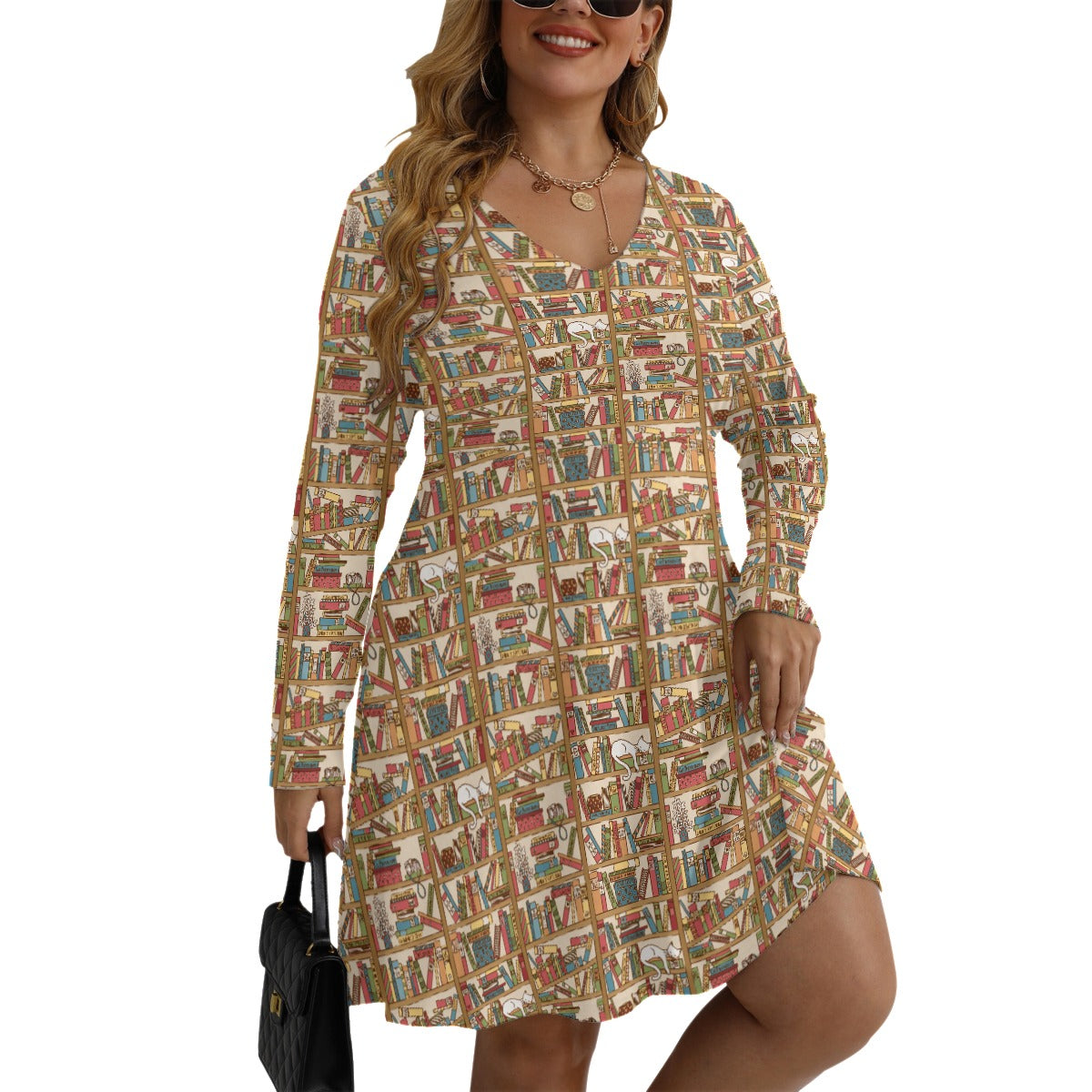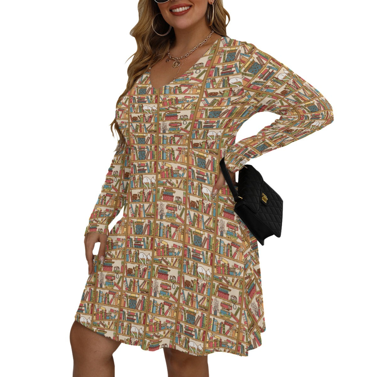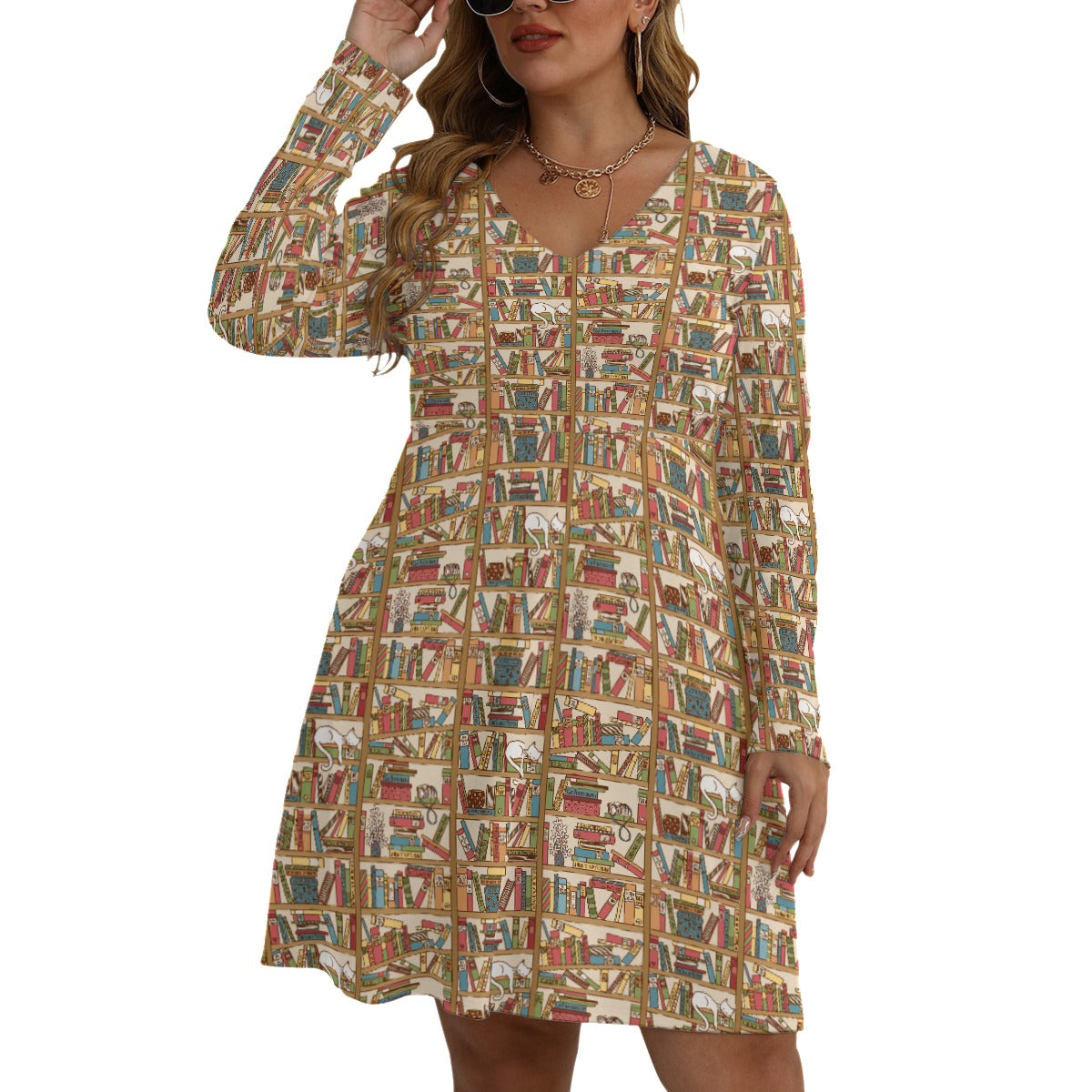 Cat Library V-neck Long Sleeve Dress