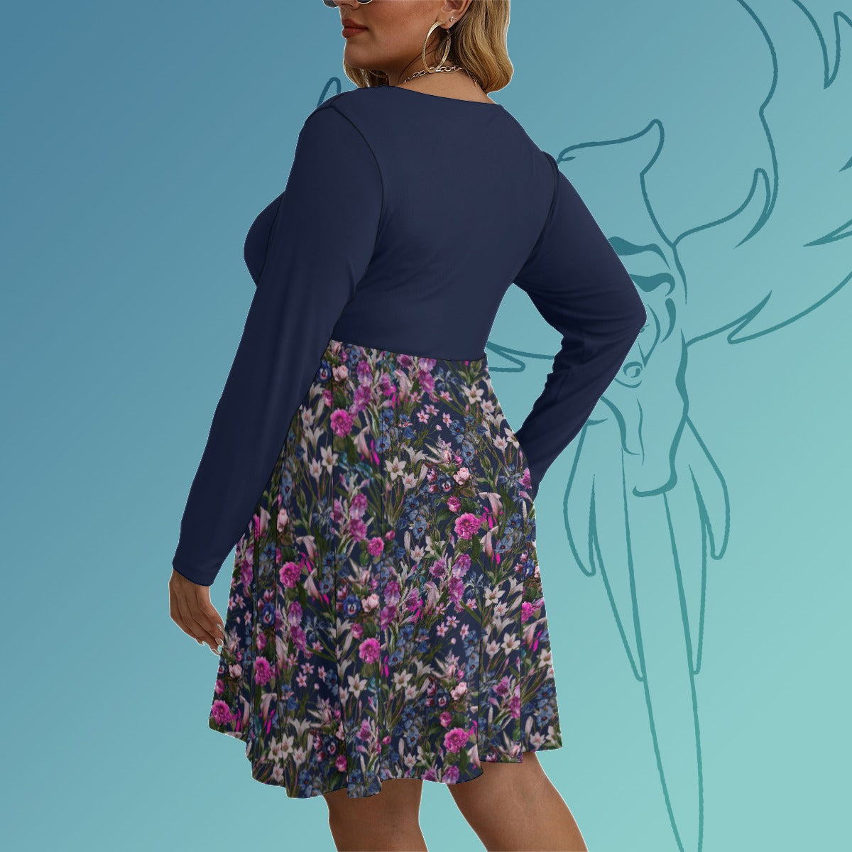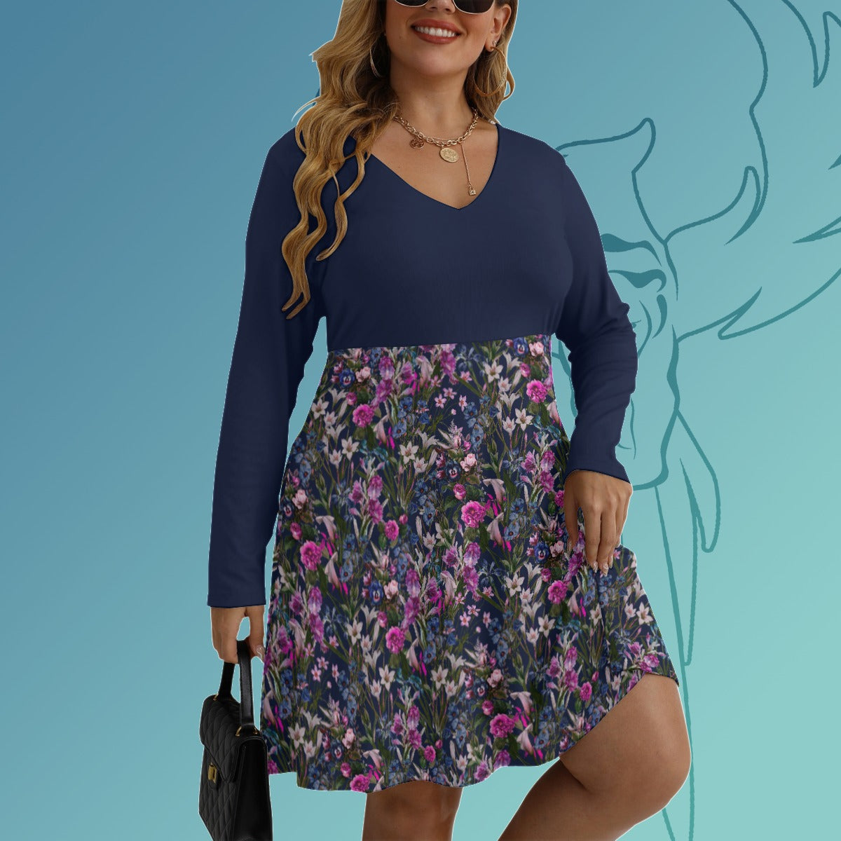 Navy Floral 2 Colourway V-neck Long Sleeve Dress