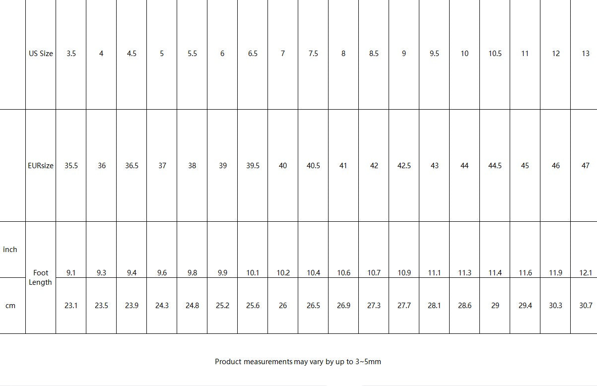| US Size | 3.5 | 4 | 4.5 | 5 | 5.5 | 6 | 6.5 | 7 | 7.5 | 8 | 8.5 | 9 | 9.5 | 10 | 10.5 | 11 | 12 | 13 | |