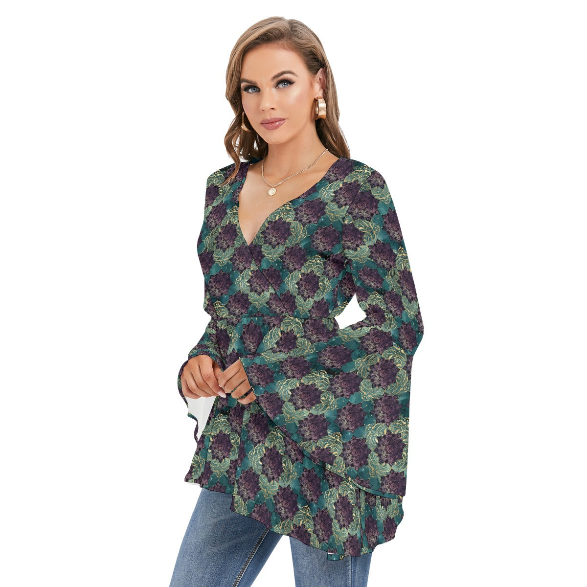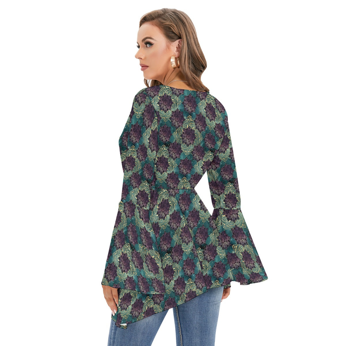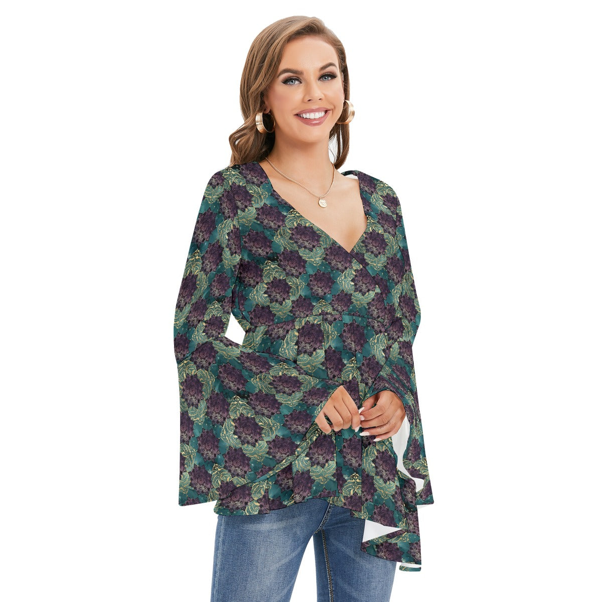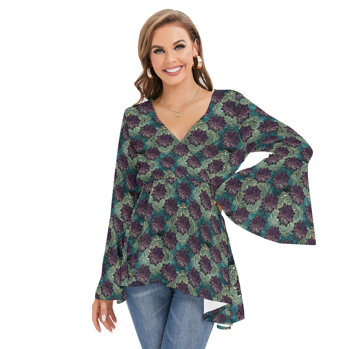 Teal Madala V-neck Blouse With Flared Sleeves